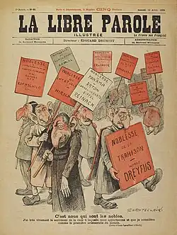 Antisemitism was a prominent factor throughout the affair. Existing prior to the Dreyfus affair, it had expressed itself during the boulangisme affair and the Panama Canal scandal but was limited to an intellectual elite. The Dreyfus Affair spread hatred of Jews through all strata of society, a movement that certainly began with the success of Jewish France by Édouard Drumont in 1886.[70] It was then greatly amplified by various legal episodes and press campaigns for nearly fifteen years. Antisemitism was thenceforth official and was evident in numerous settings including the working classes.[71] Candidates for the legislative elections took advantage of antisemitism as a watchword in parliamentary elections. This antisemitism was reinforced by the crisis of the separation of church and state in 1905, which probably led to its height in France. Antisemitic actions were permitted on the advent of the Vichy regime, which allowed free and unrestrained expression of racial hatred.