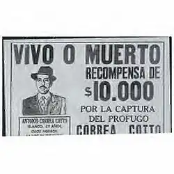 The authorities organized what was then the largest manhunt in the history of the island. They placed a bounty on his head of $10,000 ($130,692 in 2024 dollars[5]), either dead or alive, which was a first in the crime annals of Puerto Rico. The police detained over 70 friends and family members for questioning. On May 16,1952, the police was alerted that Correa Cotto was living on a farm in Hacienda Barrancas on the outskirts of the City of Ponce. When the police arrived, they called on him to surrender, but he responded by firing his gun. The police set fire to the sugar cane fields which surrounded Correa Cotto's hideout. He came out firing a gun in one hand and held a machete in the other. Under the orders of Captain Luis M. Pérez, the police opened fire on Correa Cotto, killing him.[4] Correa Cotto was buried in Ponce's Cementerio Civil de Ponce.[6]
