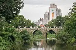 The main river is Anyang River (one of the four main tributaries of the Han River in Seoul), which is 32.2 km (20.0 mi) long. It has a basin area of 275 km2 (106 sq mi), fed by 21 tributaries. The center of the overall elliptical basin topography is low and flat. The river runs through the center of Anyang and is a common place for people to walk, jog, or ride bikes.[4] The river flows through seven cities in Gyeonggi Province. This, however, has caused major issues with pollution. River banks are often covered with parking lots or athletic fields, combined with poor sewerage systems in the upper reaches of the river. As a result, the Anyang Stream Watershed Management Committee for Water Quality Improvement had been established to address some of these issues.[4]