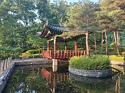 The Anyang History Museum is located in Galsan-dong, Dongan District, with the major theme of the museum being the displaying of the history and culture of the Anyang area.[35] A site featuring the banner poles from a Joongcho temple is located in Manan Gu. They are the only banner poles in Korea from the period 827AD, and are so unique that they are designated national treasure no. 4. Anyang also hosts the collected writings of Toegye Lee Hwang (1501–1570), which were written to teach his follower Kwon Ho-Mun how to write (national treasure no. 548).[36] Anyang also possesses dozens of nationally recognised 'tangible assets' including Manan Bridge, and the Maaejong rock engraving of a bell from the end of the Silla period.[37] In addition, Anyang contains the tombstone of Park Suh, a civil servant in the middle Joseon period, as well as dolmens in Pyeongchon, a stone chambered grave in Bisan dong, and a letter engraved in stone by Ji Woon Yong at Sammak Temple.[38]