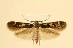 The wingspan is about 9–10 mm. The ground colour of the forewings is yellowish, sprinkled with blackish-grey. The hindwings are grey.[2]