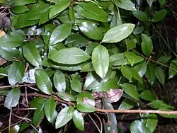 Usually a vine or a rambling shrub growing in moist areas. Leaves 4 to 8 cm long, 1.5 to 3 cm wide, wavy edged or toothed. Leaf shape varies from ovate to lanceolate. Leaf stem 2 to 5 mm long. The stem is hairless and is marked with lenticels (or raised resinous dots).[3]
