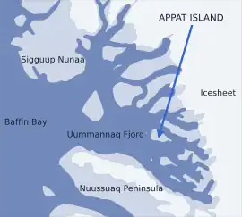 Appat Island (old spelling: Agpat) is an uninhabited[1] island in the Avannaata municipality in northwestern Greenland. At 211 km2 (81.5 sq mi),[1] it is one of the larger islands in the Uummannaq Fjord system, located in its north-central part.[2] It is the site of the former settlements of Ritenbenck and Qaqortuatsiaq.