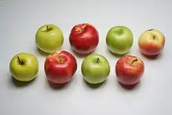 Apples are diploid, with two sets of chromosomes per cell (though triploid cultivars, with three sets, are not uncommon), have 17 chromosomes and an estimated genome size of approximately 650 Mb. Several whole genome sequences have been completed and made available. The first one in 2010 was based on the diploid cultivar 'Golden Delicious'.[21] However, this first whole genome sequence contained several errors,[22] in part owing to the high degree of heterozygosity in diploid apples which, in combination with an ancient genome duplication, complicated the assembly. Recently, double- and trihaploid individuals have been sequenced, yielding whole genome sequences of higher quality.[23][24]