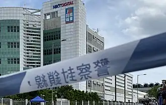 Nearly 200 police cordoned, raided, and searched the headquarters of Next Digital and Apple Daily in Tseung Kwan O Industrial Estate at 10 am after making arrests.[4] Ryan Law Wai-kwong, editor-in-Chief of Apple Daily, asked the cops to show the search warrant issued by the court. Apple Daily said such request was ignored,[4] but the Police Force later rejected such claim. The administrative Department of Apple Daily called the staff not to come to work due to unexpected situations.[5] Some journalists were prevented from picturing the office desk by the police, while those at the office had their personal information taken by the police. It was said the departments of local news, breaking news and finance news were raided.[6]