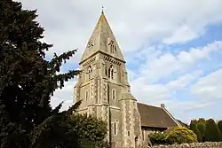 The nave is 12th century Norman and the chancel was rebuilt early in the 13th century.[4] Surviving early features include a Norman door on the south side of the nave and an Early English Gothic door to the chancel.[8] The east and north walls of the chancel have original Early English lancet windows and the south wall has a Perpendicular Gothic window that was added in the 16th century.[4] The building was altered in the 19th century. The nave was remodelled and extended to designs by the architect Ewan Christian, and in 1885–86 the tower was rebuilt to hang a ring of six bells, and the spire was added to designs by the architect William Gilbee Scott.[8] Prior to this, the church had been in 'ruinous' condition, with the rebuilding only possible at the expense of Walter Justice.[3]