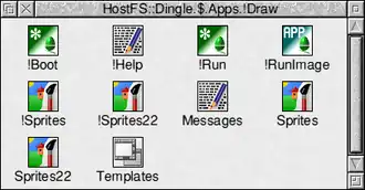 Similarly, custom icons for the Application Directory may be contained within it—either .DirIcon (in any supported image format) or AppIcon.xpm under the ROX Desktop, or !Sprites and optionally !Sprites22 under RISC OS. The RISC OS Filer automatically loads these sprite files in the absence of a !Boot file, otherwise it is left to the !Boot file to load the appropriate icons.