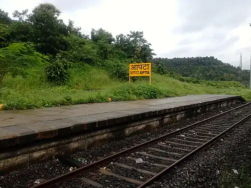 Apta railway station is a railway station on the Panvel–Roha route of Central Railway in India. The station is situated in Raigad district of Navi Mumbai city in Maharashtra. It is 83.24 km from Chhatrapati Shivaji Maharaj Terminus via Diva Junction. Its station code is APTA. It belongs to the Mumbai Railway Division of Central Railway.[2]
