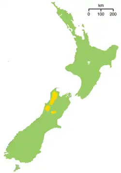 Greater spotted kiwis once lived in numerous areas throughout the South Island, but because of predation by invasive species, the remaining kiwi are now restricted to three localities.[23] These kiwi live in higher altitude areas. Populations are present from northwestern Nelson to the Buller River, the northwest coast (Hurunui River to Arthur's Pass), and the Paparoa Range,[1] as well as within the Lake Rotoiti Mainland Island.[24][25] The Southern Alps population is particularly isolated.[24] Great spotted kiwis reside in complex, maze-like burrows that they construct.[26] Up to fifty burrows can exist in one bird's territory.[27] They will often move around, staying in a different burrow every day.[21] Bird's Nest Fungus sometimes grows in these burrows.[28] Their habitat ranges in elevation from sea level to 1,500 m (4,900 ft), but the majority are concentrated in a range from 700 to 1,100 m (2,300–3,600 ft) in a subalpine zone. These kiwis will live in tussock grasslands, scrubland, pasture, and forests.[1]