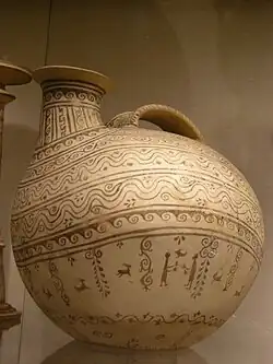 The Messapian school shows far less originality than the other two. When it appears for the first time in the 5th century, the Messapian is already a mixed style, to a great extent Hellenised. Some traces of an earlier geometric tradition still survive, though overlaid and almost stifled by the foreign innovations. In the early 5th century clepsydra, lozenge and band, the old elements of the Italian geometric, are still in existence. But the uncontaminated geometric is very rare in Messapia; the native potter can hardly resist adding his zone of Greek ivy-leaves, a maeander, a rosette, or even a bird. The chief centres of manufacture for such ware (cf. example 4) were at Rugge (Rudiae), near Lecce, and Egnatia, each originally a Rhodian colony. The strongest Greek influence came therefore from Rhodian sources, though others may have had some share. The hallmark by which all Messapian pottery, except a little of the very earliest, can be detected, is the round disc about the size of a large coin at the stop and bottom of each handle. This peculiarity has caused the nickname of "trozzella" to be given to such forms (cf. example 5 and Gallery).[6] Besides these the only shapes generally employed are the krater with column or handles, the jug, and a simple kind of bowl.