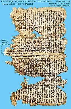 The siglum AqTaylor (also: Taylor-Schechter 12.186 + AS.78.412; 12.187; 12.188; vh203, TM 62306, LDAB 3469) are fragments of a palimpsest containing a portion of the Palestinian Talmud in upper script,[1] and part of the Book of Psalms of Aquila's Greek translation of the Hebrew Bible in lower script.[2] This latter is a Greek biblical manuscript written in codex form. This manuscript has been dated after the middle of the fifth century C.E., but not later than the beginning of the sixth century C.E.