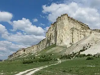 The vertical white rocky wall rises above the valley of the Biyuk-Karasu river. The height above sea level is 325 m, the height difference between the valley and the top of the rock is 100 m.