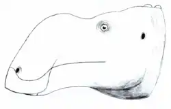 In 2019, the species was reclassified into a new genus and given its binomial name Aquilarhinus palimentus. Aquilarhinus comes from the Latin words 'aquila' meaning 'eagle' and 'rhinus' meaning 'nose', referring to the unique shape of the rostrum, and palimentus comes from the Latin words 'pala', meaning shovel, and 'mentus', meaning chin, referring the shape of the predentary and its resemblance to a spade or shovel.[6]
