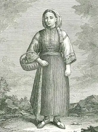 Arbanasi (Арбанаси) is the old ethnonym that the South Slavs used to denote Albanians, dating back to the Middle Ages.[5][6][A][a][7] The ancestors of Arbanasi people are Catholic Albanians who originated from the villages of Briska (Brisk), Šestan (Shestan), Livari (Ljare), and Podi (Pod) located in Skadarska Krajina (Albanian: Krajë) region, then part of the Muslim ruled Ottoman Empire (now modern southern Montenegro).[8][9] They fled to avoid circumstances of military service and due to religious discrimination or conversion to Islam.[8][10] Every one of the inhabitants of the village of Pod had left for migration in 1726, leaving the village completely abandoned. Ruins of old houses can still be found in the area today. [9] They originated from the hinterland, demonstrated by the names of fish coming from Croatian.[4] This population migrated into what is today Croatia in two different periods,[4] first in 1655 to Pula, Istria[1] and then 1726–1727 and 1733, to the Zadar area, supported and planned by Archbishop of Zara Vicko Zmajević and the Venetian republic to repopulate the countryside and hinterland of Zadar.[9]