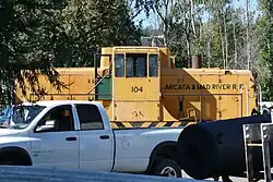 Lumber boomed again in the 1950s, the A&MR served fifteen shippers on its 7.5-mile (12.1 km) railroad.[7] In 1956 the Simpson Logging Company purchased the Northern Redwood Lumber Company operations, which included the A&MR.[8] The average daily car loadings were enough to place the road among the highest paying railroad properties per mile in the United States.[7] At the time of its closure, AMR ran 4 General Electric 44-tonner diesel-electric locomotives (#101-#104) and one Whitcomb 80DE-7b 80 ton diesel-electric locomotive.[7]