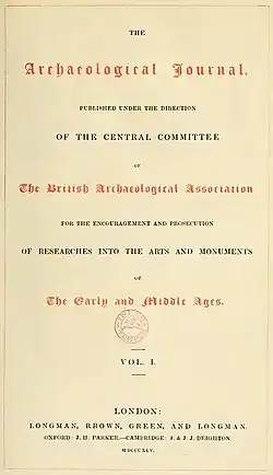 The Archaeological Journal was established as a quarterly journal of the British Archaeological Association in 1844. When conflicts within that association led to the foundation of the rival British Archaeological Institute (now the Royal Archaeological Institute) in 1845, the Institute retained the journal, the Association instead publishing the Journal of the British Archaeological Association. Publication was quarterly (sometimes falling to twice or three times a year) until 1926. In 1927 the journal became an annual publication. From volume 51 (1894), issues bore the notice "second series".