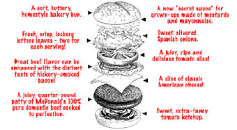 The Arch Deluxe was a quarter pound of beef on a split-top potato flour sesame seed bun, topped with a circular piece of peppered bacon, leaf lettuce, tomato, American cheese, onions, ketchup, and Dijonnaise (a portmanteau of Dijon mustard and mayonnaise) sauce.[6]
