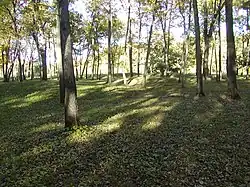 The Late Woodland in Iowa is perhaps best known for effigy mounds, large, low mounds shaped like animals such as birds and bears. Effigy mounds are distributed across southern Wisconsin, northern Illinois, and northeast Iowa. A large concentration of mounds in several groups is preserved at Effigy Mounds National Monument. Like most mounds in Iowa, excavation reveals that these mounds were commonly used as sacred burial locations but contain few artifacts.[33] Recent ground-penetrating radar survey of selected mounds at Effigy Mounds National Monument reveal that many are badly disturbed, but others appear to be comparatively intact.[34] The Folkert Mound Group in central Iowa contains an enigmatic cruciform mound that may or may not be astronomically aligned.[35][36]