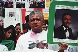 ![]() Elliott holds up a picture of his son, Archie Elliott III, during the National Emergency March for Justice Against Police Brutality in April 1999 | |