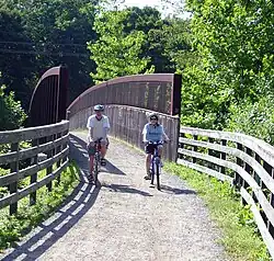 The community received its first name, Arch Hill, after an arched bridge was built over the present-day U.S. Route 9 in 1839. The bridge carried the Old Croton Aqueduct over the highway until 1924, when the bridge was deemed to be a traffic hazard and was demolished. The aqueduct was then rerouted to flow beneath the highway. In November 1998, long after the aqueduct was shut down, the bridge was replaced as a crossing for aqueduct walkers, bikers, and equestrians over the particularly dangerous section of the highway.[2] The new bridge connects the Rockefeller State Park Preserve with Rockwood Hall, and was built to resemble the two bridges over Route 117 which the Rockefellers had built.[3]