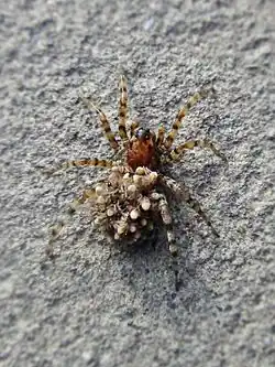 The posterior eyes have small patches of white hairs to the sides and the rear, and the AME are larger than the ALE.[1][6]