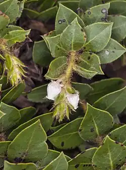 The dense inflorescence is crowded with rounded, urn-shaped white flowers, each only 3 to 5 millimeters long. The fruit is a hairy, glandular drupe about 7 millimeters wide.