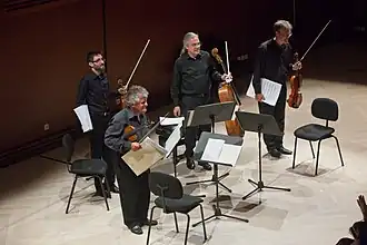 The Arditti Quartet is a string quartet founded in 1974 and led by the British violinist Irvine Arditti. The quartet is a globally recognized promoter of contemporary classical music[1] and has a reputation for having a very wide repertoire. They first became known taking into their repertoire technically challenging pieces. Over the years, there have been personnel changes but Irvine Arditti is still at the helm, leading the group. The repertoire of the group is mostly music from the last 50 years with a strong emphasis on living composers. Their aim from the beginning has been to collaborate with composers during the rehearsal process. However, unlike some other groups, it is loyal to music of a classical vein and avoids cross-genre music. The Quartet has performed in major concert halls and cultural festivals all over the world and has the longest discography of any group of its type. In 1999, it won the Ernst von Siemens Music Prize for lifetime achievement, being the first and only group to date to receive this award.