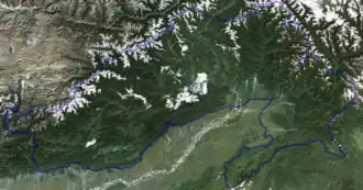 Relief range varies between plains that are a few hundred meters in height and mountains above 7,000 metres (23,000 ft).[15] The elevation of the towns of Naharlagun, Pasighat and Tezu in the south are 290 m, 155 m and 210 m respectively,[7] while Kangto, Nyegi Kangsang and the Gorichen group of mountains are some of the highest peaks in this region of the Himalayas.[16] The southern borders of Arunachal Pradesh are encompassed by the Shivalik ranges which merge into plains.[15] The hills and mountains have associated features such as valleys and intermontane plateaus, that is plateaus between mountains.[15]