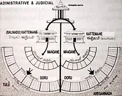 They have a somewhat elaborate system of caste government.[8] In every village there are two headmen, the Grāma Gowda and the ottu Gauda. For every group of eight or nine villages there is another head called the Māganē Gauda, and for every nine Māganēs there is a yet higher authority called the Kattēmanēyava.[9]