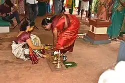 At this moment the gathered relatives and public will declare their assent saying "Edde Karyo Panpere" (a good work ritual). This Declaration is the same as the recital in Sullia and Kodagu region which is in Kannada. Here the reference to "Aramane and Gurumane" is essentially to royalty of Ikkeri and Sringeri Mathadhipathies respectively.[11]