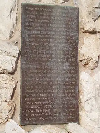 The Areopagus sermon refers to a sermon delivered by the Apostle Paul in Athens, at the Areopagus, and recounted in Acts 17:16–34.[1][2] The Areopagus sermon is the most dramatic and most fully-reported speech of the missionary career of Saint Paul and followed a shorter address in Lystra recorded in Acts 14:15–17.[3]