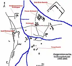 The ancient name of the civil settlement and the fort are known to us from the second century geographer Claudius Ptolemy and from the Tabula Peutingeriana.[2] Inscriptions supporting this name have not yet been discovered. Around the year 150 Ptolemy referred to the civil settlement of Argentovaria as the "second polis" of the Celtic Rauraci people after Augusta Raurica. The current name "Altkirch" (popularly "Kirchenbuckel") derives from a medieval church which, together with its cemetery has been identified west of the south gate of the fort.