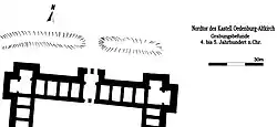 Oedenburg-Altkirch represents a new type of fort within the comprehensive late antique fortress construction program. The Valentinian castrum measured 93.30 by 126 metres (306.1 ft × 413.4 ft), was precisely aligned with the cardinal points, had a square floor plan, and covered an area of approximately 1.2 hectares (3.0 acres). The building material consisted for the most part of tephrite, a type of volcanic rock found in the area. The Roman unit of measurement used in the construction could be determined on the basis of still intact, mortared brick slabs. It was exactly 66 centimetres (26 in), and thus corresponded to two Gallic pedes Drusani—about 0.3327 metres (13.10 in). The unusual construction of this fort resembles a much smaller 65 by 56 metres (213 ft × 184 ft) facility of the same time period in the Pfalzel district of Trier (Roman Augusta Treverorum), which has been known as the palatiolum since the Middle Ages. There are clear indications that it was furnished with splendid interior decoration, for example mosaics, and thus could have had a primarily ceremonial function. Similar finds are missing for Oedenburg-Altkirch, but it could have been designed by the same architect.