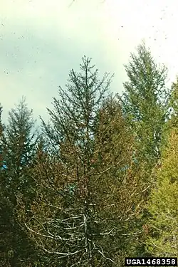 The larvae mainly feed on Pinus strobus. They are pale green larvae and can reach a length of about 12 mm.