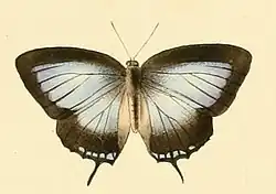 The female is above blue with a broad blackish-brown margin of the wings, in the hindwing along the posterior part of the border with a series of white-blue spots. Beneath blackish-brown with a broad, joint, whitish band, hindwing with a broad, greenish-blue, black-spotted marginal band.[2]