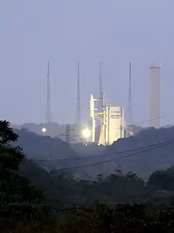 The 97th Ariane 5 launch (1st of 2018) was planned to take place within a launch window of 45 minutes starting on 25 January 2018 at 22:20 UTC (19:20 local time). The launcher engines effectively were ignited at the very beginning of that window, from Ariane Launch Complex No. 3 (ELA-3) in Kourou, French Guiana.[2]