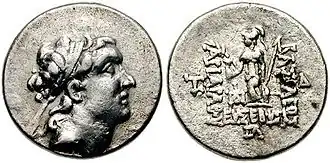 1. ^ Boyce, Mary; Grenet, Frantz (1991). A History of Zoroastrianism: Zoroastrianism Under Macedonian and Roman Rule. BRILL. pp. 267–8. ISBN 9004092714. His son Ariarathes IV (220-c.162), thus half-Macedonian by blood, set the title "king" on his coins, and attached to his name the cognomen Philopator. He also introduced the device of Athena holding Nike, which became the standard reverse type of the Ariarathid coinage. […] His son Ariarathes V (c.162-130), with the cognomen Eusebes, was an ardent philhellene, and no longer wears the tiara on any of his coins. In his youth he studied in Athens, where he became friends with the future Attalus III, the last king of Pergamum. He in his turn married a Seleucid princess, his cousin Nysa, daughter of Antiochus III; and he refounded Mazaka and Tyana as Greek poleis…