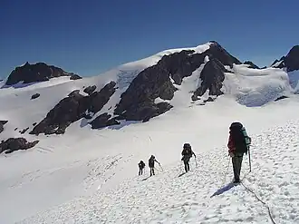 Aries is a 6,533-foot (1,991-metre) mountain summit located within Olympic National Park in Jefferson County of Washington state. Its neighbors include Mount Olympus, 2.46 mi (3.96 km) to the west, Athena 1.7 mi (2.7 km) to the southwest, and Mount Mathias 1.11 mi (1.79 km) to the northwest.[1] Aries is wedged between the Hoh Glacier and the Humes Glacier, and immediately northeast of Blizzard Pass. Precipitation runoff from the mountain drains into headwaters of the Queets and Hoh Rivers. This mountain was named by glaciologists Richard Hubley and Edward LaChapelle in 1955, in preparation for the International Geophysical Year.[4] It is named for Aries in keeping with the Greek and Roman mythology naming theme surrounding Mount Olympus.