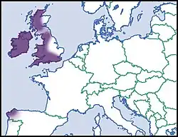 This species is native to the northern part of the Iberian Peninsula, but has been introduced in various countries and islands including: