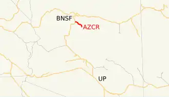 The Clarkdale Arizona Central Railroad (reporting mark AZCR) is an Arizona short-line railroad that operates from a connection with the BNSF Railway's Phoenix Subdivision at Drake, Arizona. The Drake Switching Company also operates a connection between the BNSF and the AZCR in Drake. The AZCR runs 37.8 miles (60.8 km) from Drake to Clarkdale, Arizona. An excursion train also runs on the line through Verde Canyon and is operated by the same owners under the Verde Canyon Railroad. The AZCR is owned by David L. Durbano but is currently under contract to be sold pending approval from the FRA and Surface Transportation Board spring of 2025.