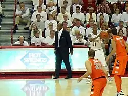 Broyles hired Sutton starting with the 1974–75 season, and the hire proved to be a turning point in the program's history. Sutton's first campaign with the Hogs turned out to be a mildly successful one that put fans on notice, with an 11–3 conference record that was good for second place in the SWC, as high as the program had finished in conference play in seventeen years.[6] Sutton's second team did not perform as strongly in conference play, but improved its overall record. The excitement behind Razorback basketball was palpable as renovations began on what was then officially Barnhill Arena after it was renamed in 1973 for former athletic director and head football coach, John Barnhill.[39] Sutton's second team also had the core players that would elevate the Razorbacks to a national power under his leadership, the famed in-state players known as the "Triplets," Ron Brewer, Marvin Delph, and Sidney Moncrief (who later became the first player in program history to have his number retired).[40]