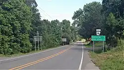 Highway 16 begins in Siloam Springs in Benton County, 3 miles (4.8 km) from the Oklahoma border. The highway's western terminus is US 412/Highway 59 in a commercial area; it runs south to Highway 16S (Kenwood Avenue). Highway 16 continues southeast, exiting the city and becoming a steep, winding road through the oak-hickory forest. Near the Washington County line, Highway 16 enters a small segment of the Ozark National Forest disconnected from the larger section of the forest north of Russellville. At the county line, Highway 16 serves as the eastern terminus of Highway 244, and briefly runs east along the county line as a section line road.[3] In Washington County, Highway 16 continues east in the National Forest, serving the Lake Wedington Recreation Area, which contains the Lake Wedington Historic District, and crossing the Illinois River, the eastern boundary of the National Forest, near Savoy. It continues to wind through sparsely populated forested land, passing the unincorporated community of Wedington Woods before entering Fayetteville, the third-largest city in Arkansas and county seat of Washington County.[4]