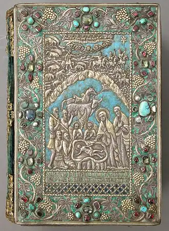 Description The gospel was created in two parts; the book itself dates to the 13th century, while the elaborate metalwork cover and accompanying adornments are attributable to the 17th century. The design used on the front plaque of the book, depicting the Nativity and the Adoration of the Shepherds , is directly inspired by the work of Dutch woodcutter Christoffel van Sichem . The metalwork itself was produced in Kayseri, Turkey .[ 1]