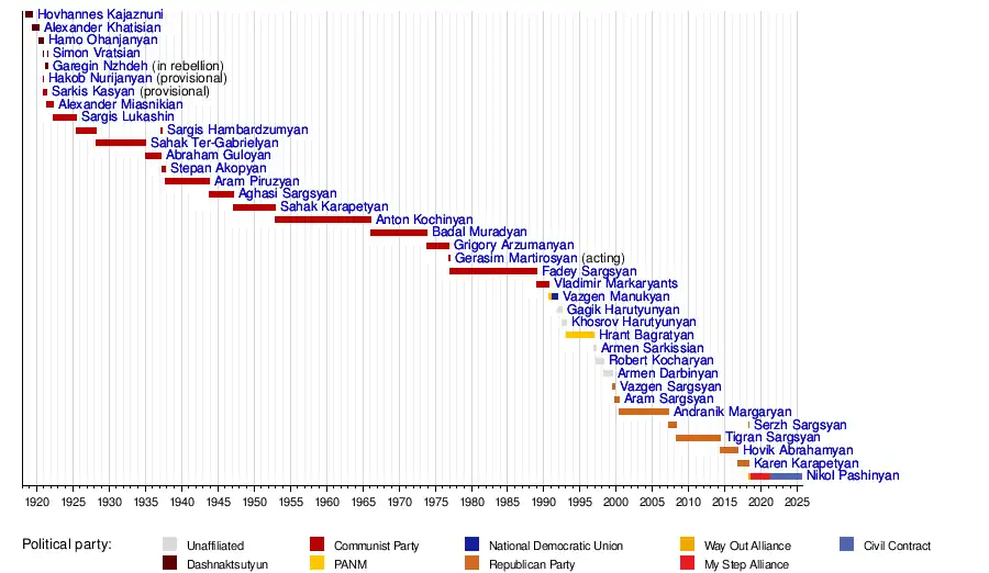 | 1 | Vazgen Manukyan (born 1946) | | PANM | 13 August 1990 | 25 September 1991 (Independence) | 1990 | 1st | Independents • PANM |