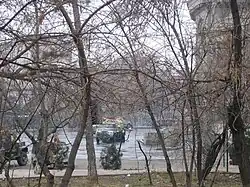 On 1 March, at 7:30 am, Armenian security forces violently dispersed the protesters, who were then reported to number about 700–1,000,[37] and broke up a tented camp being used by the protesters in Freedom Square. Witnesses say that the government authorities planted guns and grenades among the sleeping protesters, and then claiming that they were thwarting an attempted coup, attacked the protesters.[38][39] Police used bludgeons and electric shockers to beat and electrocute the ralliers.[15] Levon Ter-Petrosyan was captured at Freedom Square and placed under house arrest. Some fled when police attacked them.[14] Dozens were reported to have sustained severe injuries and more than 100 protesters were arrested.[14] A witness told Human Rights Watch that several rows of Special Forces in riot armor, with helmets, plastic shields and rubber truncheons, started approaching from the left and right sides of Freedom Square. The witness said that police, without prior warning, sprayed water and descended on the demonstrators, using rubber truncheons and electric prods. "People started running towards Northern Avenue, but were chased by the police."[14] By 11:00 am, Freedom Square was completely cordoned off by police and large water cannons were being used to clear the site of debris and blood (with riot police trying to prevent passersby from taking photographs). The Karapi Lich café was cordoned off with a large canvas so that it could not be seen what took place inside.