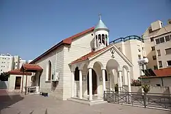 The Virgin Mary cathedral was built between 1976 and 1981 by architects Iacovos & Andreas Philippou, with financial help from the World Council of Churches, the Evangelical Church of Westphalia, the Republic of Cyprus, the Holy Archbishopric of Cyprus and the faithful. Located next to Nareg Elementary School, its foundation stone was laid on 25 September 1976 by Archbishop Makarios III and Bishop Nerses Pakhdigian. On 16 April 1978, the Co-adjutor Catholicos Karekin II blessed the 16 columns of the church, while the inauguration and consecration of the cathedral took place on 22 November 1981 by Catholicos Khoren I and his Co-adjutor Karekin II. It is the only church in Cyprus built in a traditional Armenian style, with a central octagonal dome and a smaller dome for the bell. The church was renovated externally in late 2005 in memory of the Tutundjian family, killed in the Helios air accident, while the belfry was also repaired that year, in memory of archpriest der Vazken Sandrouni.[2] Liturgies are held every Sunday. The church celebrates on the nearest Sunday to 21 November, feast day of the Presentation of Mary. The parish priest (as of 2000) is Fr. Momik Habeshian.