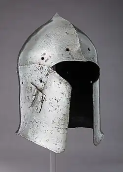 The earliest surviving armet dates to 1420 and was made in Milan.[2] An Italian origin for this type of helmet therefore seems to be indicated. The innovation of a reduced skull and large hinged cheek pieces was such a radical departure from previous forms of helmet that it is highly probable that the armet resulted from the invention of a single armourer or soldier, and not as the result of evolution from earlier forms.[2] However, a number of Italian bascinets dating to c. 1400 (sometimes termed 'Venetian great bascinets') were discovered in Chalcis, Greece; these possess a single hinged cheekpiece (the other being immobile). This may have had some influence on the development of the armet.[3]