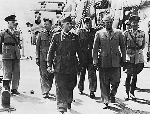 ![]() Marshal Pietro Badoglio (at left) and General Dwight D Eisenhower (at right) with Lord Gort,[a] Air Chief Marshal Arthur Tedder,[b] Lt. Gen. Sir Noel Mason-MacFarlane,[c] and General Harold Alexander,[d] aboard the British battleship HMS Nelson prior to the signing of the surrender document at Malta. | |
