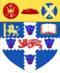 | Strathclyde, granted 7 December 1964 Escutcheon: Per pale, Gules and Azure, a saltire Argent cantoned between an antique crown in chief Or and three cinquefoils Ermine in the flanks and base; on a chief Or a wave-packet Sable between two open books proper, fore-edges and binding of the First The arms contain elements of those of two predecessor institution the Royal College of Science and Technology and the Scottish College of Commerce. The royal crown and Scottish saltire are from the former and the books representing learning are from the latter. The wave packet linking the books indicates technology. The three cinquefoils and the partial red background of the shield reference the ancient kingdom of Strathclyde and the blue background modern Scotland. The crown signifies both the ancient kingdom and a royal connection through the grant of royal status to then Royal Technical College in 1912.[63] | |
