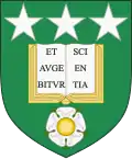 | Leeds, granted 10 August 1905 Escutcheon: Vert an open book Proper edged and clasped Gold inscribed with the words "ET AUGEBITUR SCIENTIA" between in chief three mullets Argent and in base a rose of the last seeded Proper. The three stars (mullets) are taken from the arms of the city of Leeds and derived originally from the coat of arms of Sir Thomas Danby who was the first mayor. The open book represents learning. The white rose is a symbol of Yorkshire | |